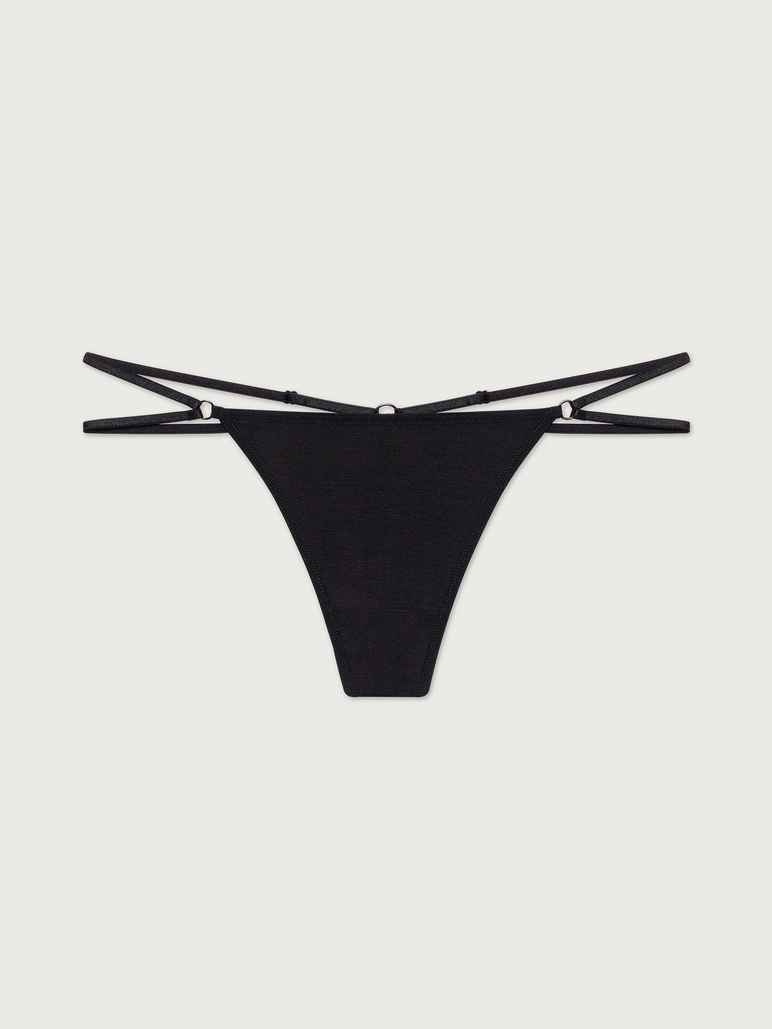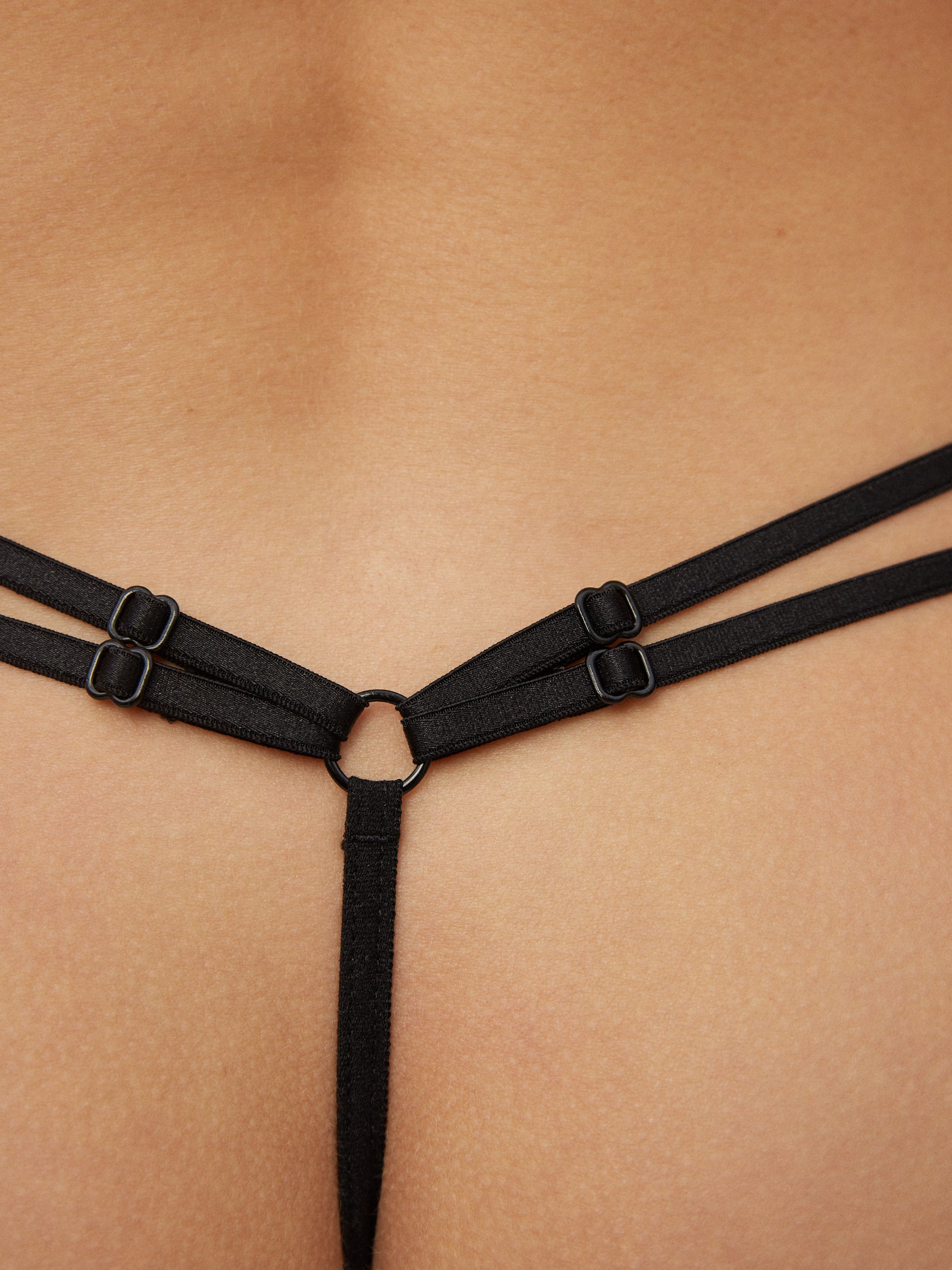 Ein verführerischer schwarzer Tanga mit zarten, verstellbaren Trägern, die den Körper wunderschön betonen.