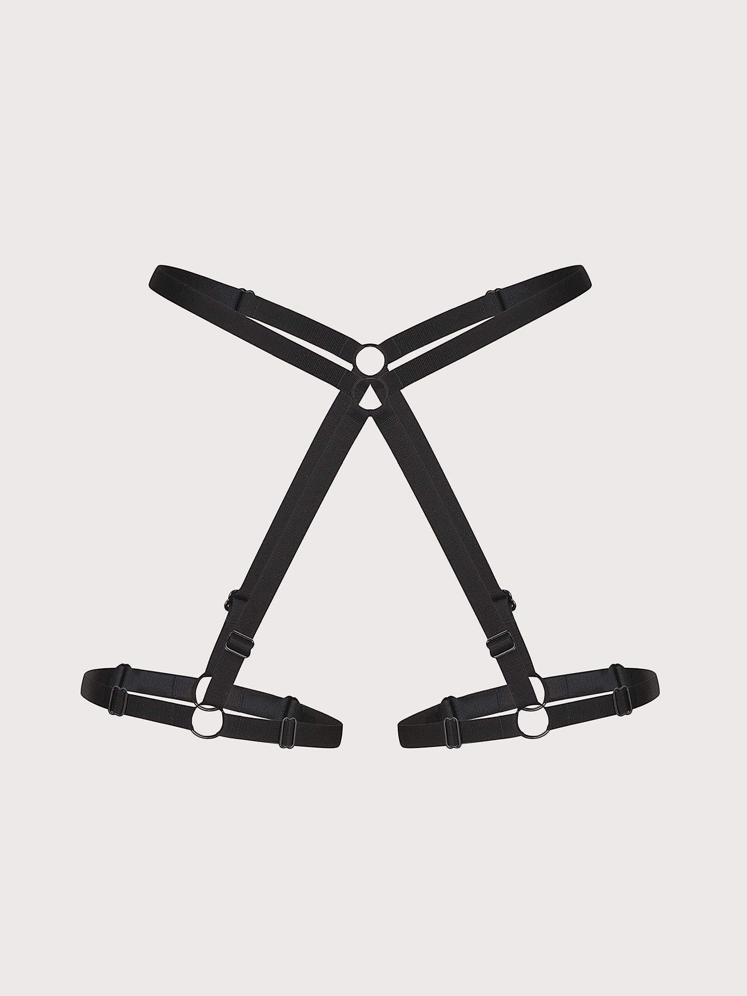 Verführerischer offener Slip aus weichem Satin-Gummi. Schwarze Metallbeschläge. Größenverstellbar.