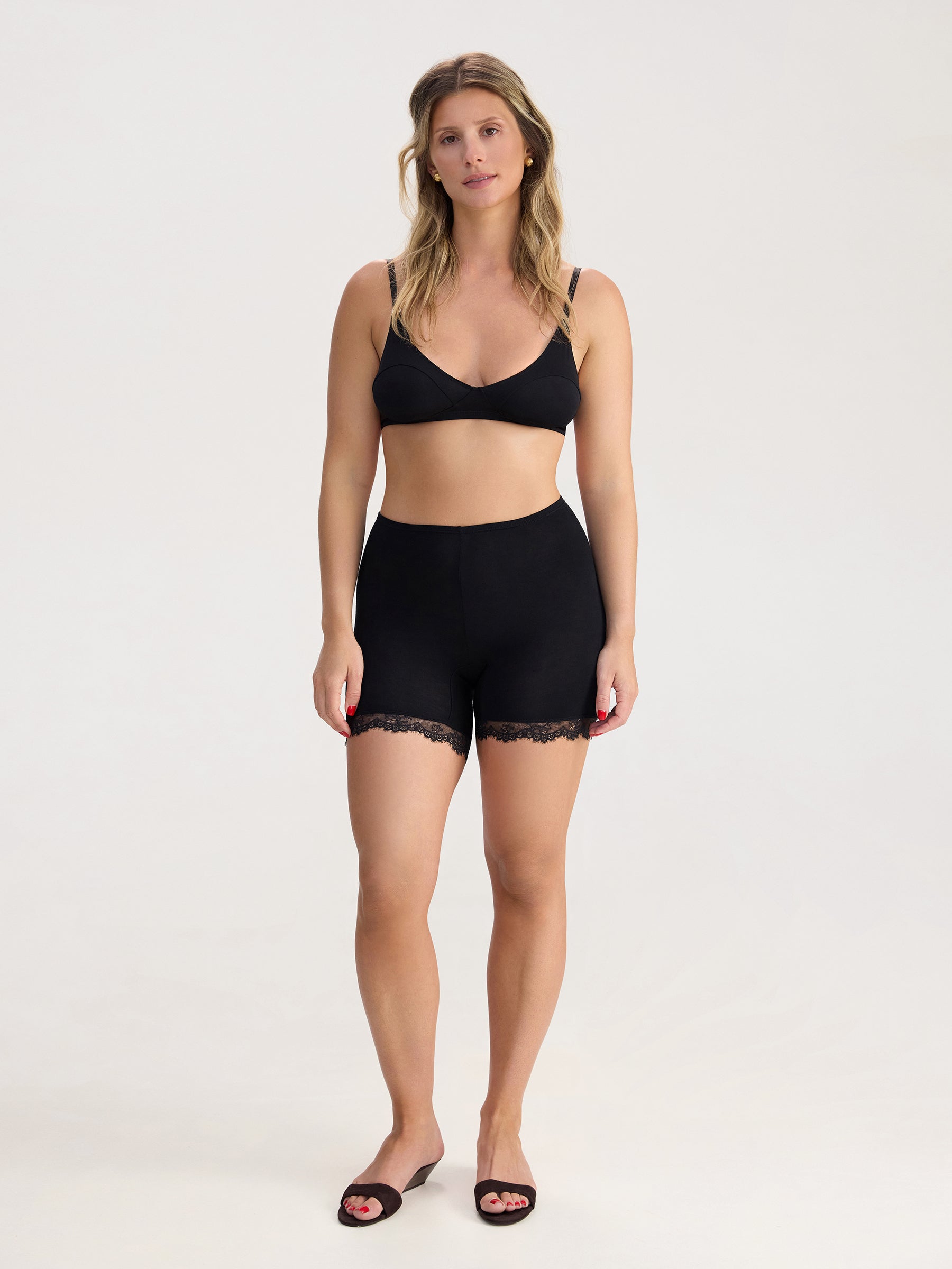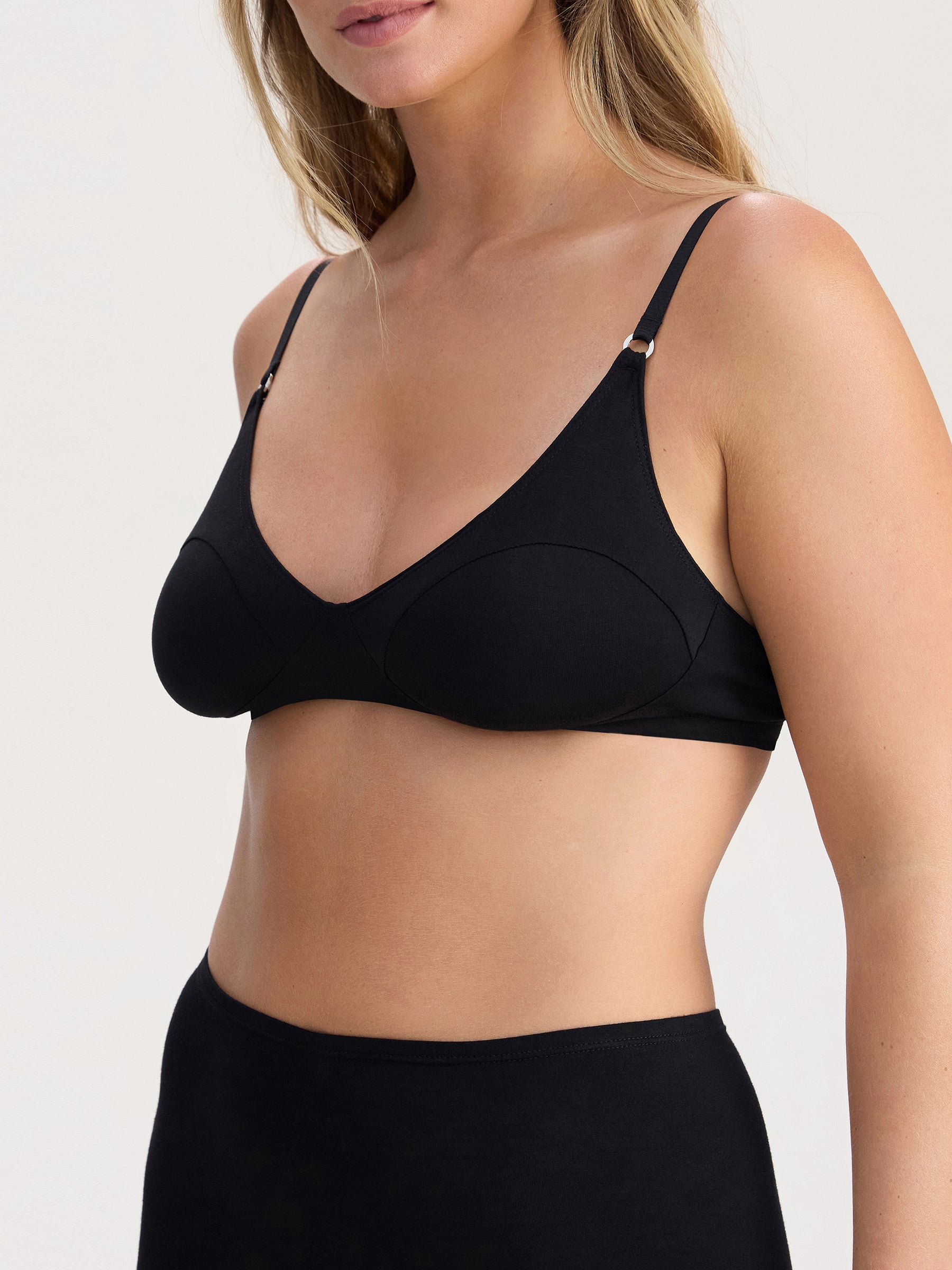 Schwarzer Softcup-BH, der sanften und zuverlässigen Halt ohne Metallbügel oder Schaumstoffpolsterung bietet.