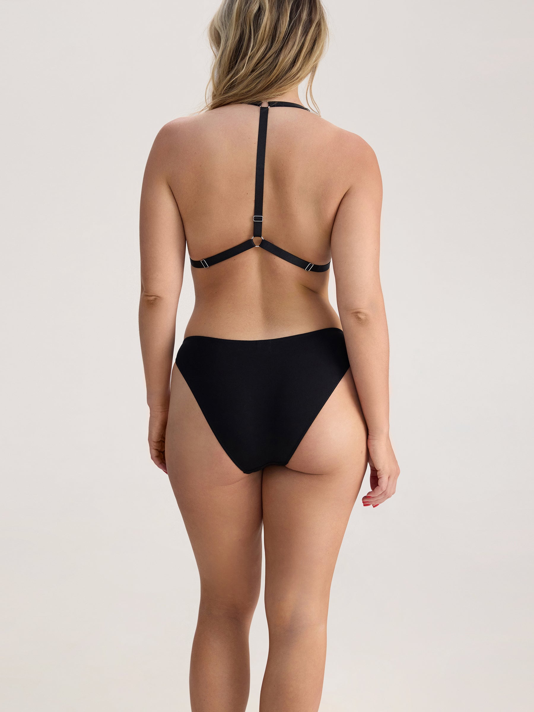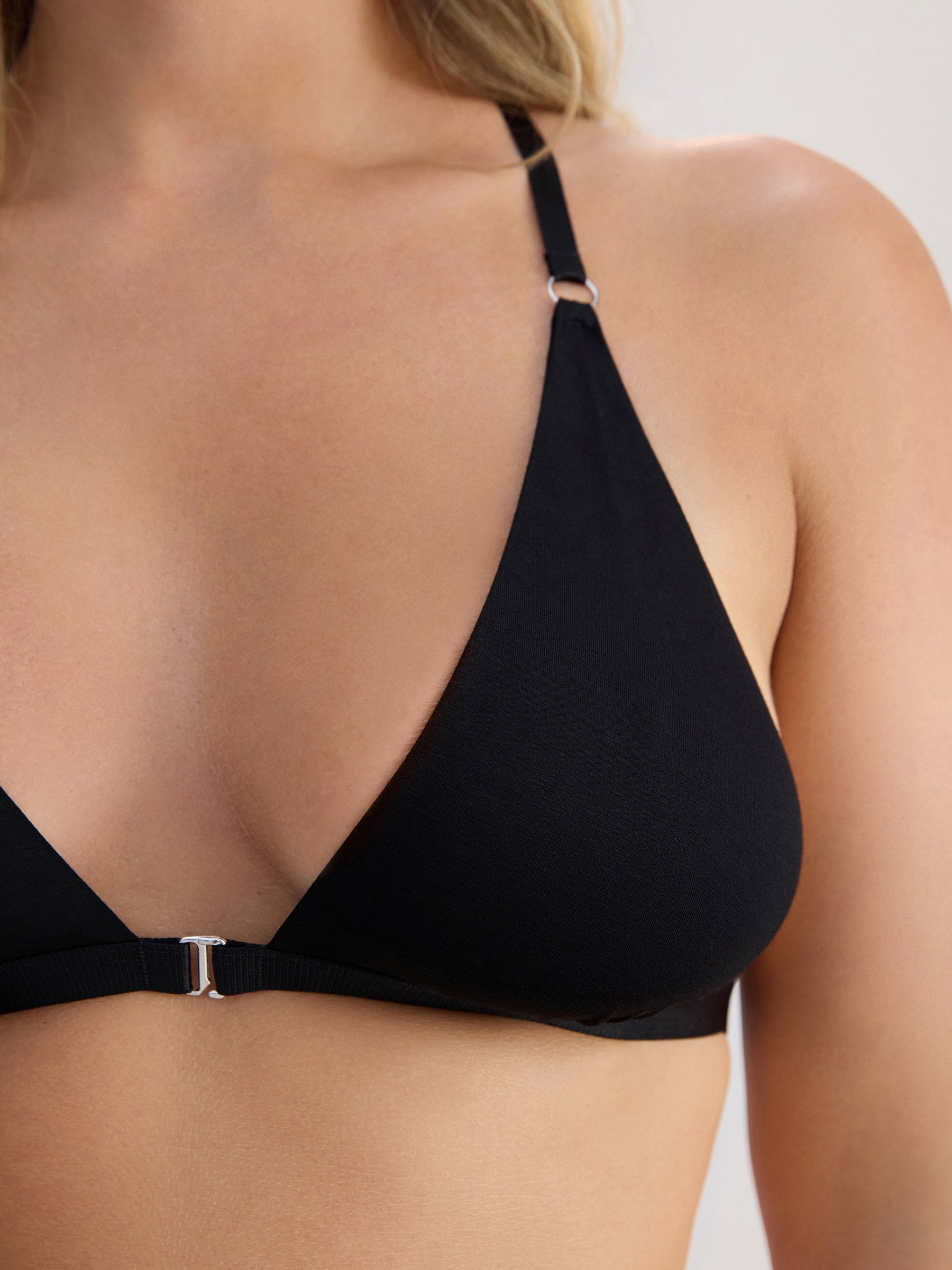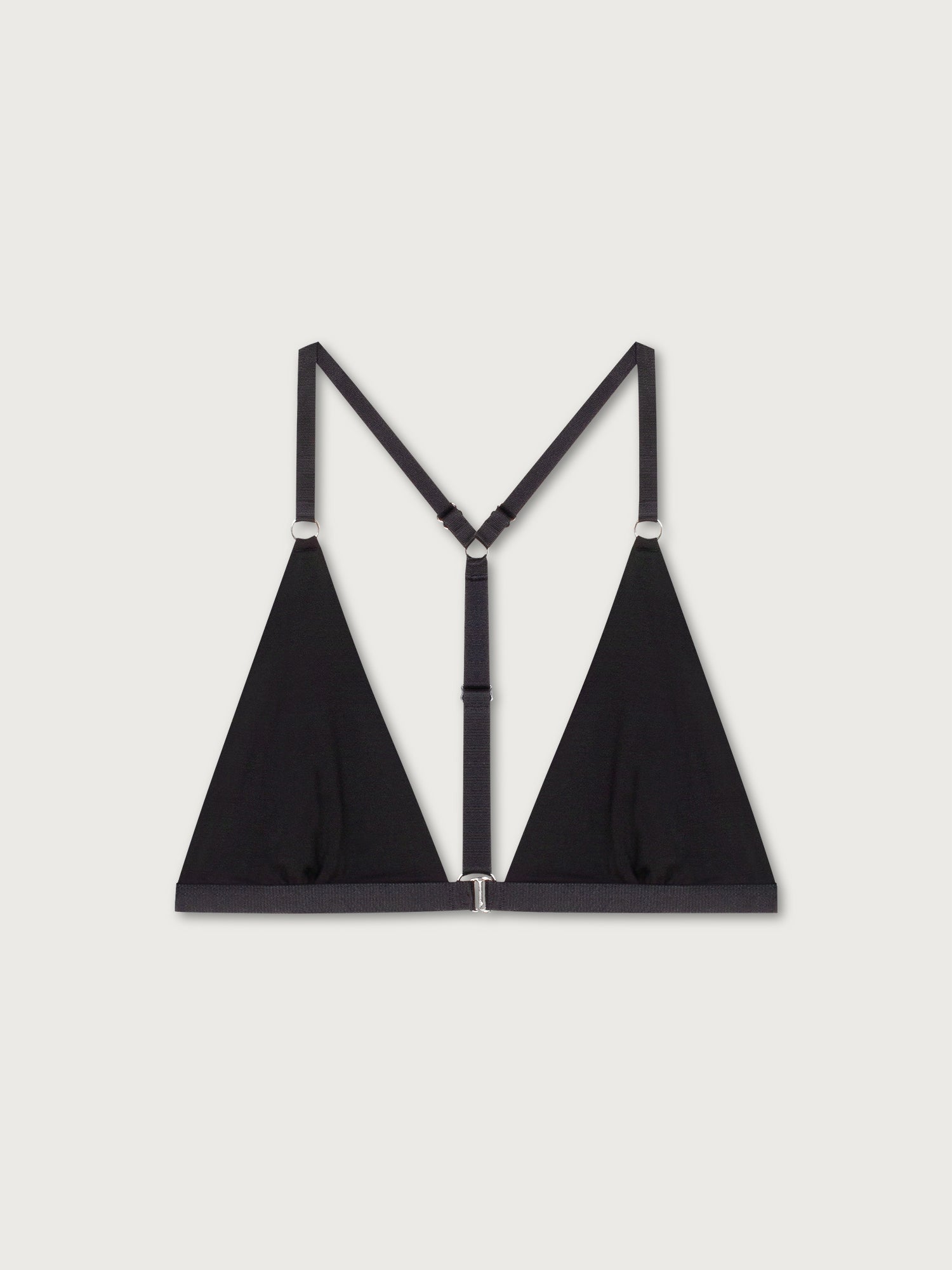 Weightless triangle cups, statement back detail, and hook closure at the front. The wireless cups are made of two layers of fabric. The straps on the back and under the bust are adjustable. Metal fittings in silver color.
