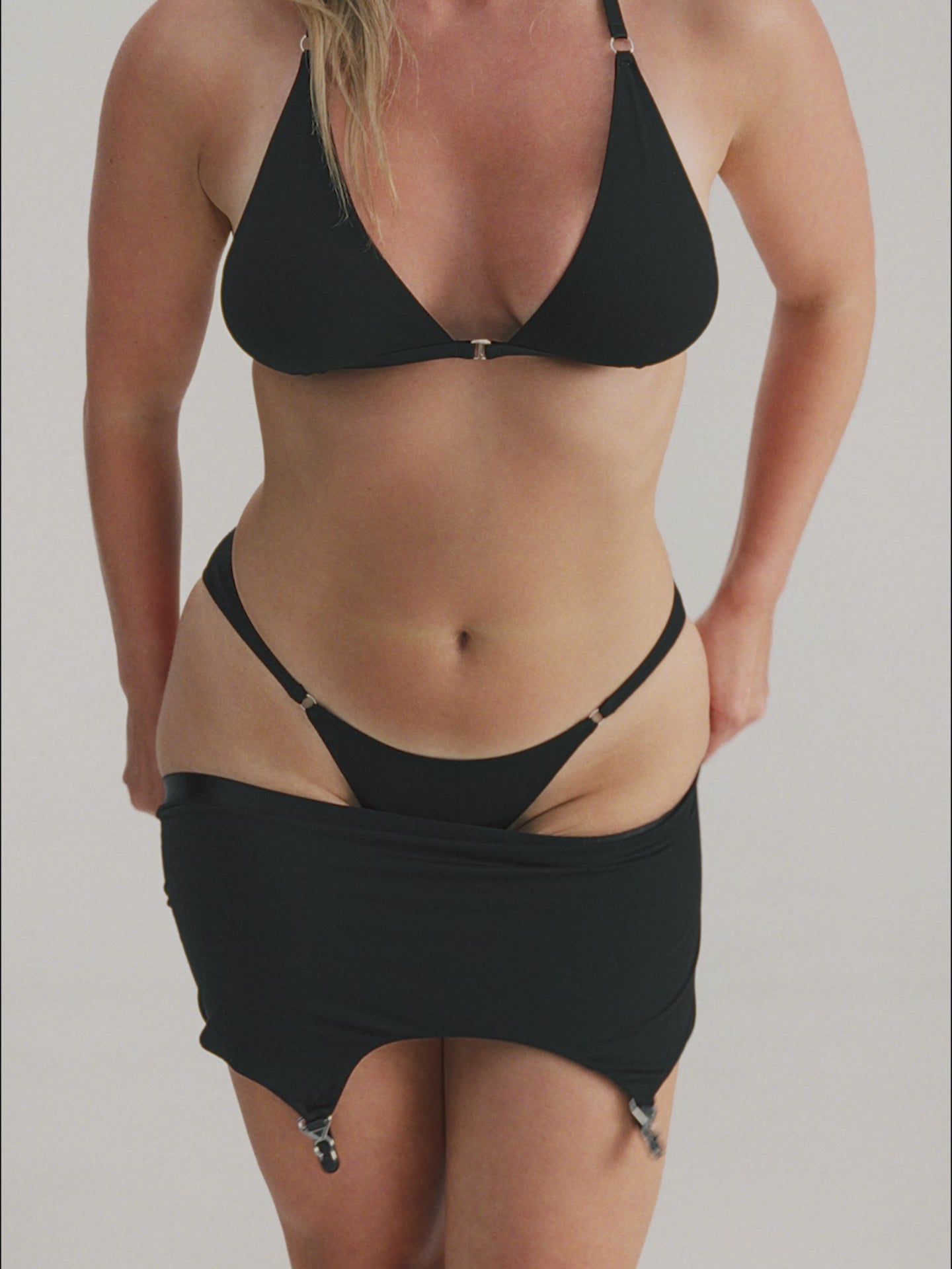 Black vintage-style suspender belt. Features four reliable garter clips and waist adjustment. Silver-toned metal fittings adds a luxurious, refined touch.