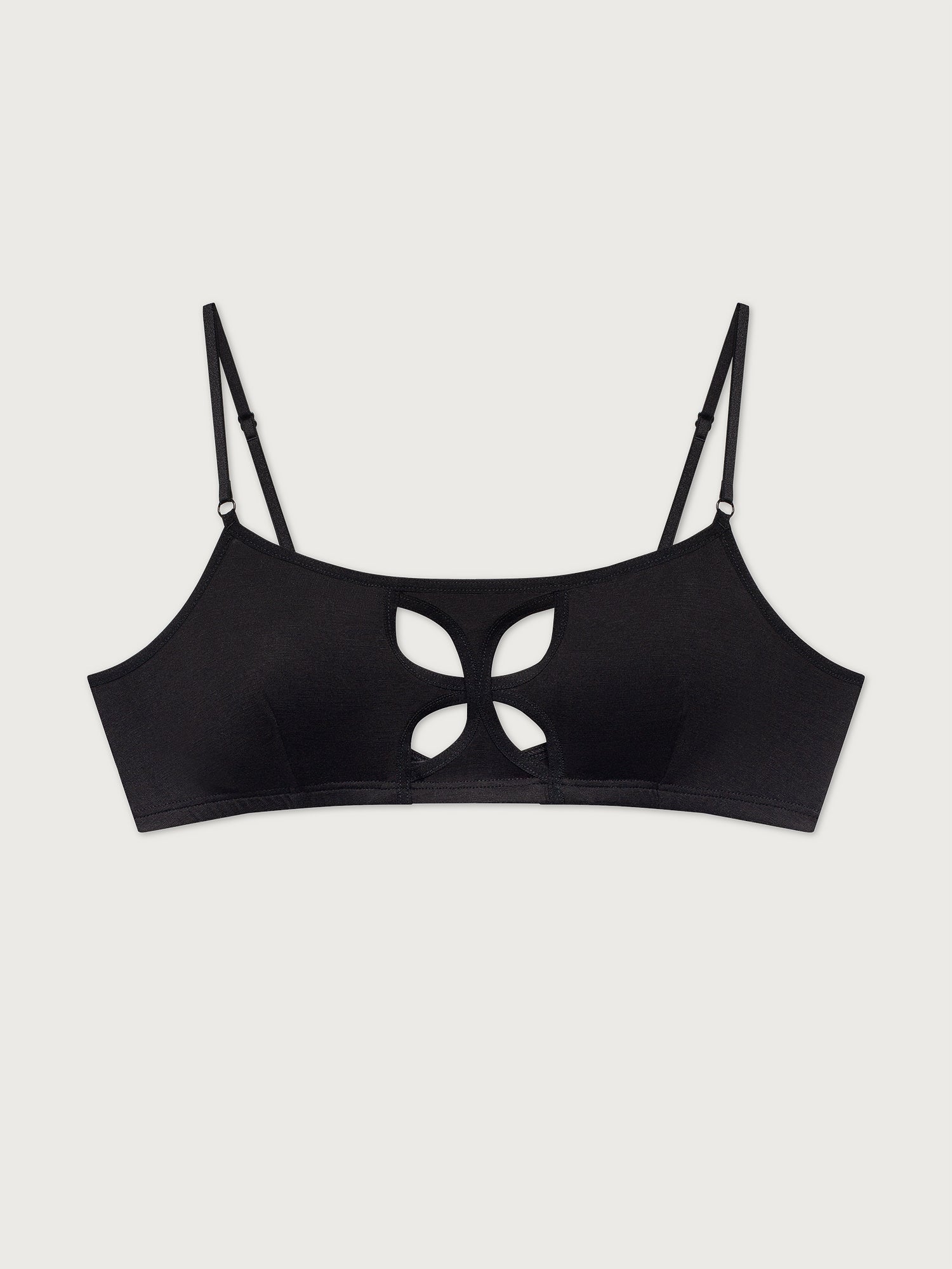 Soft bandeau top with flower-shaped cutouts. One layer of fabric with delicate soft elastics trim.