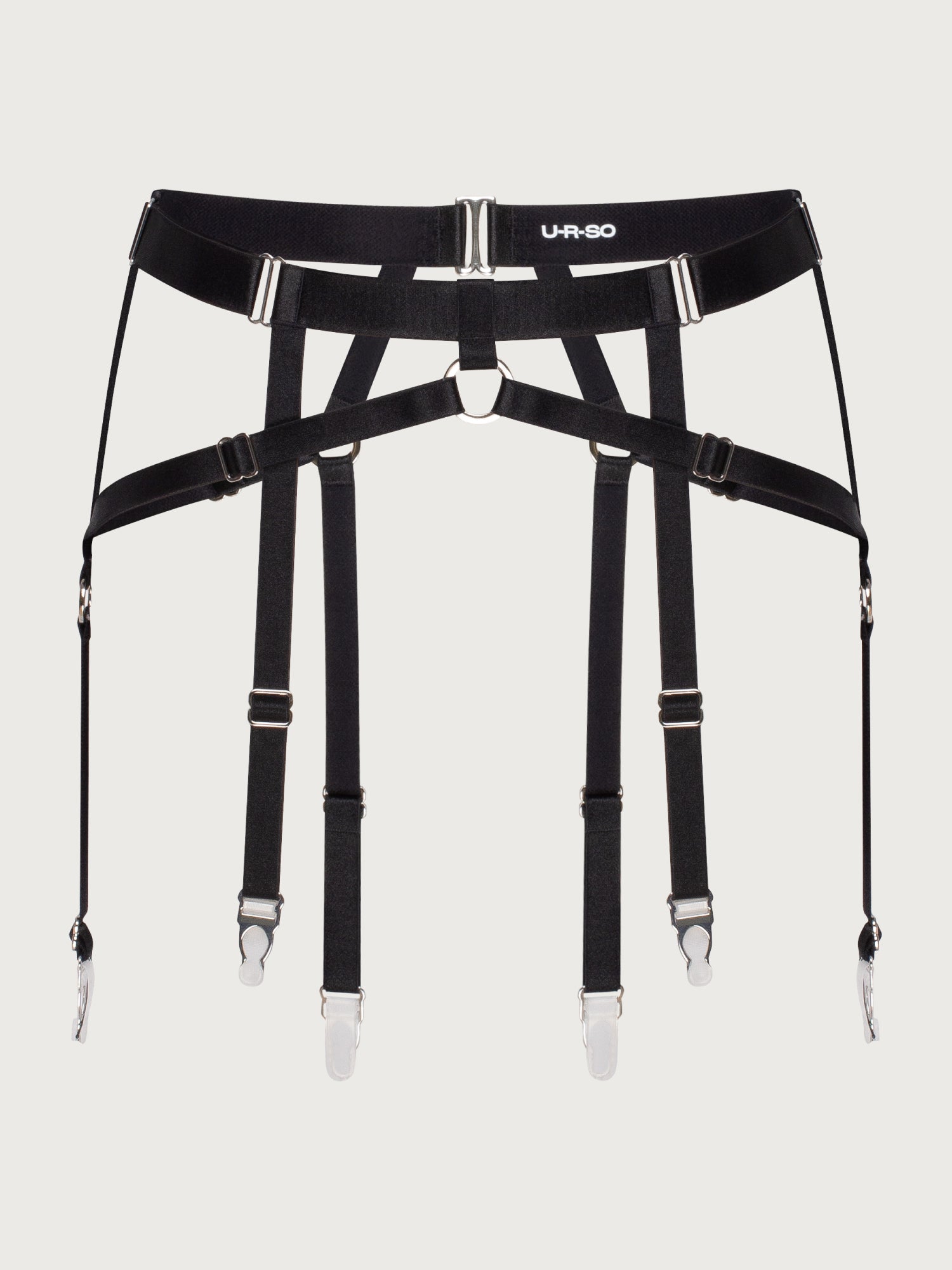 Seductive garter belt made from soft elastic straps. Features an adjustable fit, four reliable garter clips, and a hook closure at the waist.