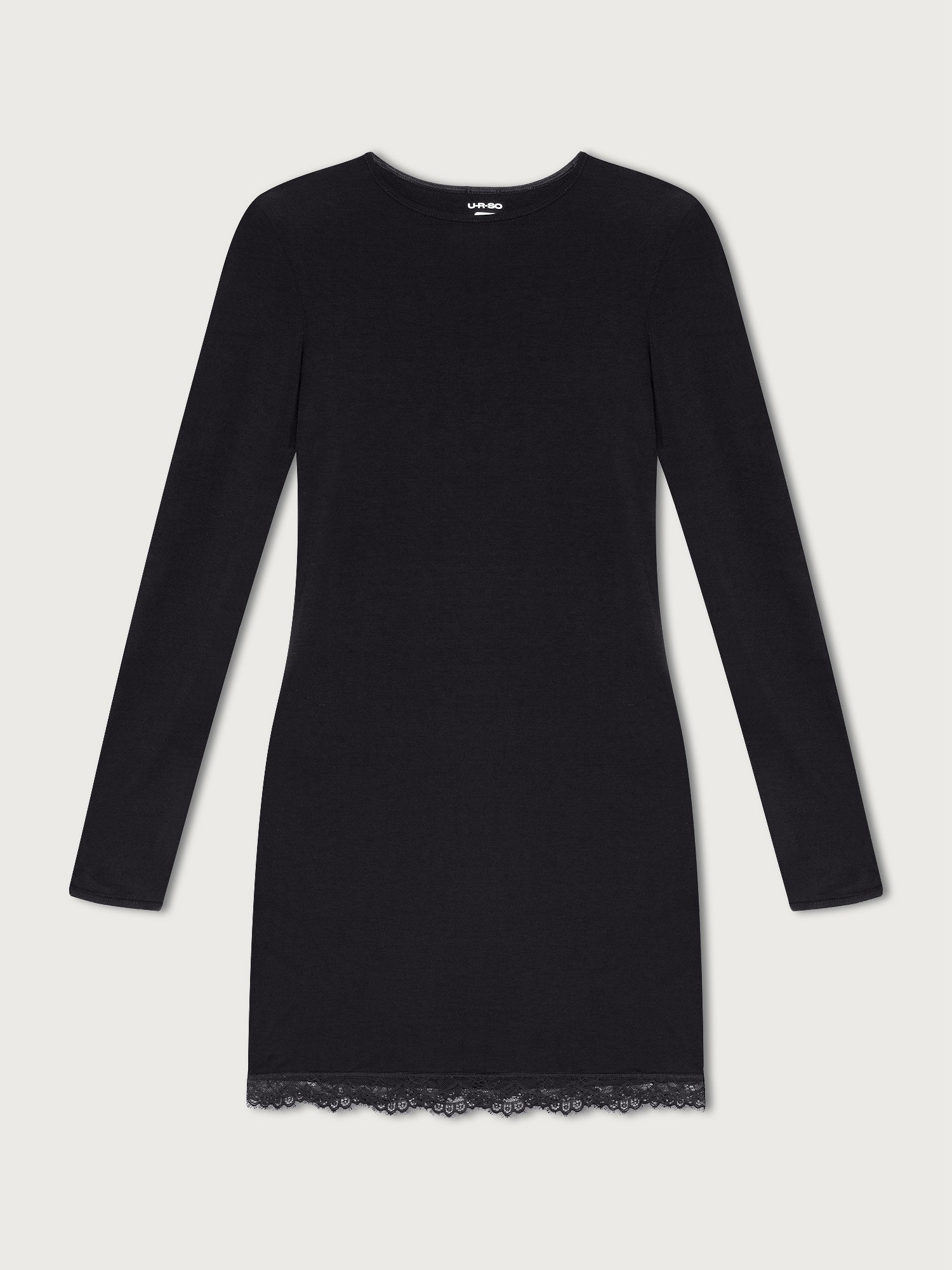 A seductive and extremely comfortable short black dress with long sleeves and lace trim. It envelops with tenderness and delicately emphasizes the lines of the body.
