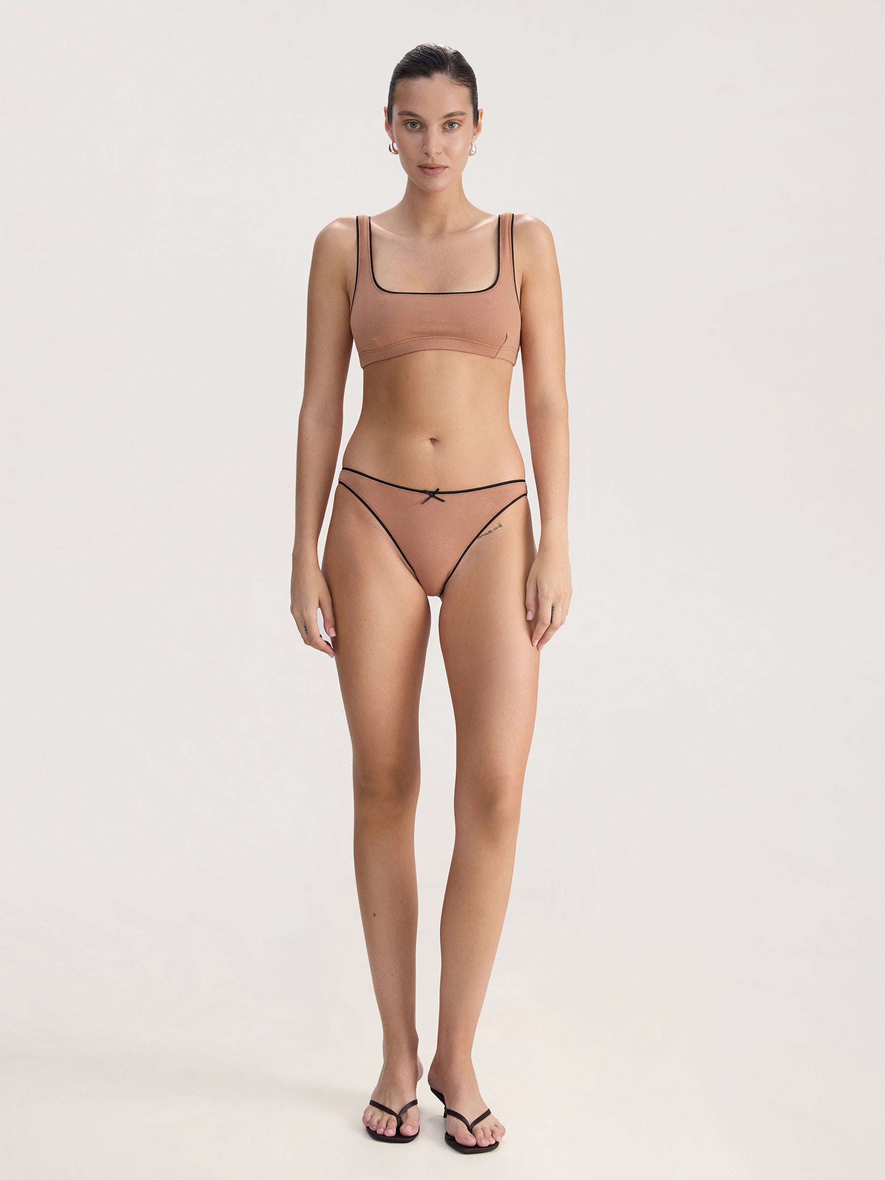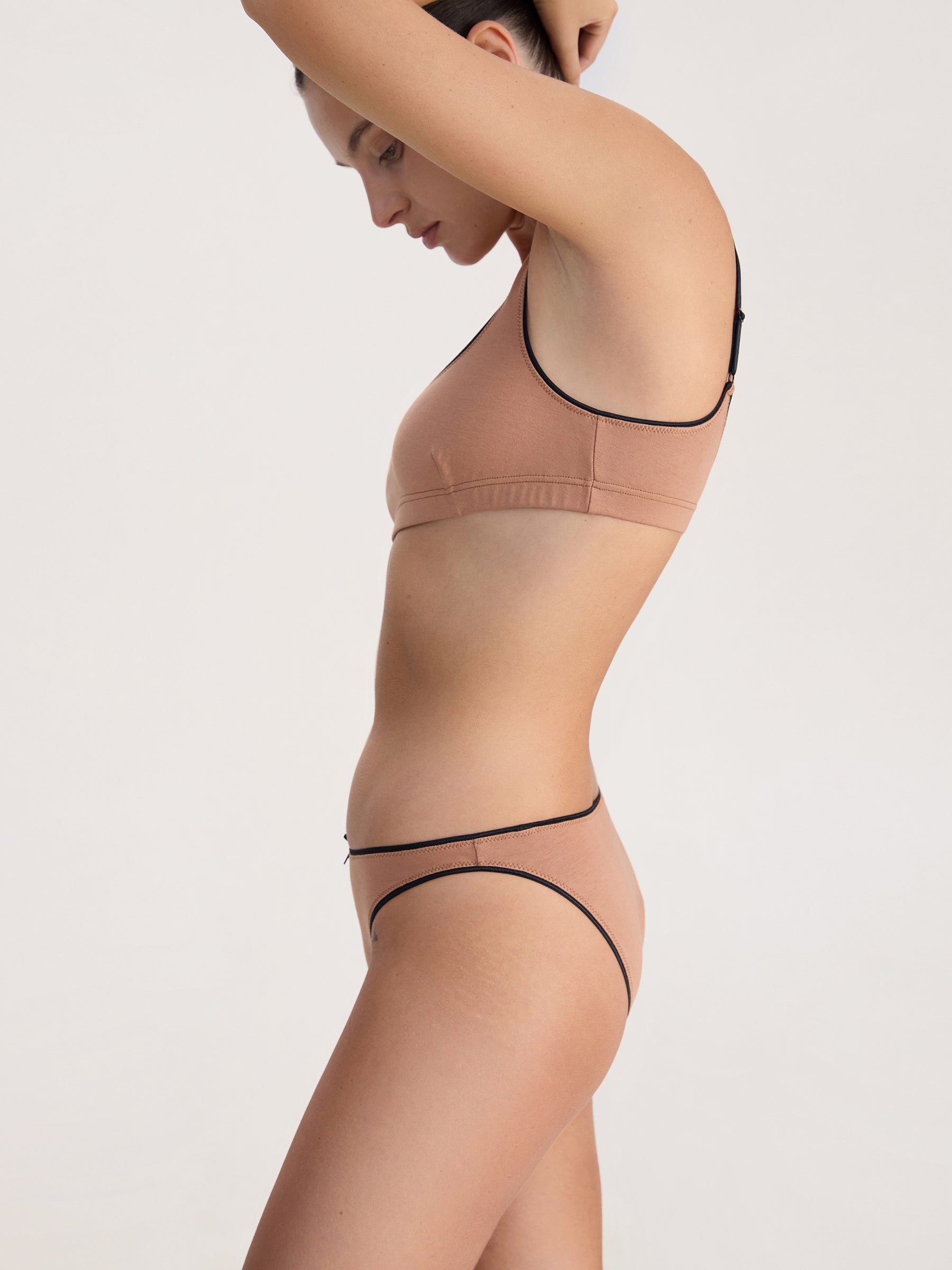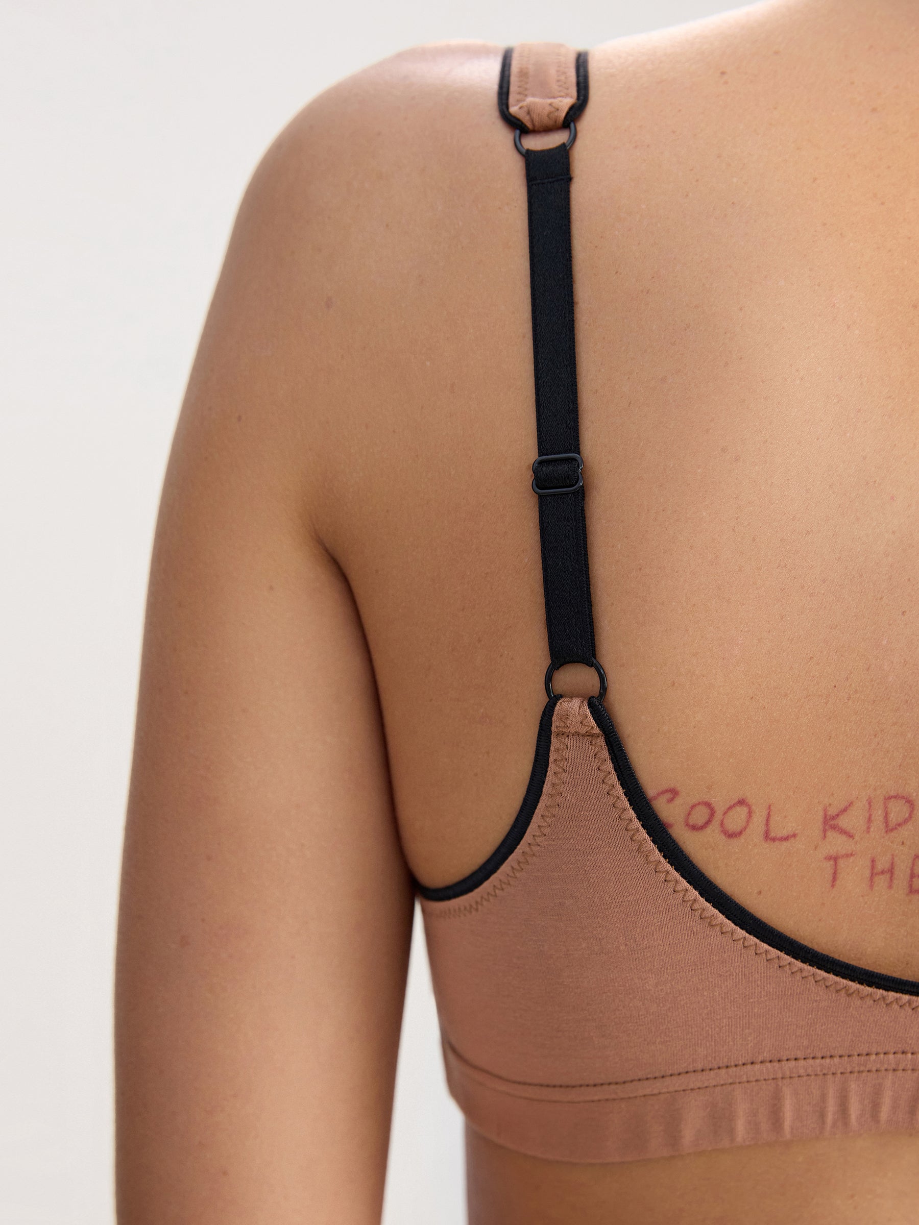A soft top with a square neckline and wide straps designed to gently and securely support the bust. A double layer of fabric with a delicate trim with soft elastics in contrasting black. Non-adjustable.
